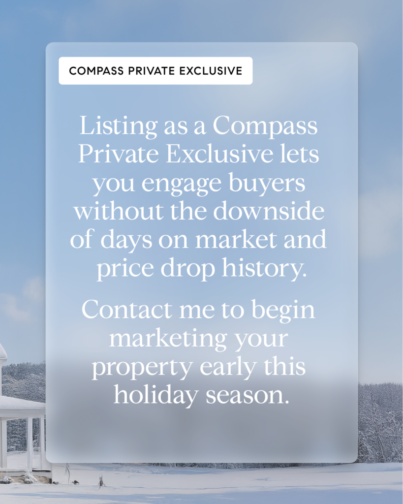This holiday season, don’t let the usual market slowdown stop you. With Compass Private Exclusives, you can keep your home sale on track and ready for success.